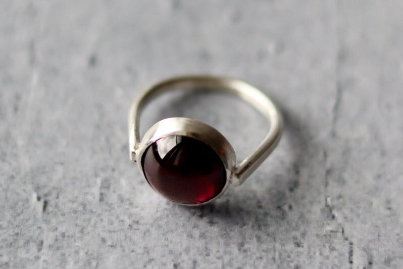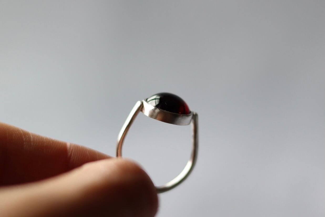 ガーネットの深い赤が肌をより美しく見せてくれます。シンプルなデザインなので重ね付けにも便利です。お手元のアクセントにいかがでしょうか。